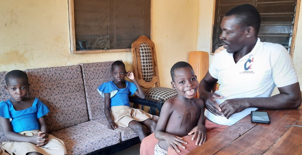 Der Vater lebt mit den drei Kindern in der Nähe des Flughafens in sehr bescheidenen Verhältnissen. Er kann keiner Arbeit nachgehen, da seine Mutter schon sehr alt ist, und der kleine Sohn behindert ist. Er braucht ständige Betreuung und der Vater kann es sich nicht leisten, den kleinen Jungen tagsüber in einer Behinderten Einrichtung unter zu bringen. Die beiden Mädchen gehen in die Primärschule. Im vergangenen Jahr kam die Familie mit den Überweisungen der Mutter einigermaßen über die Runden, da in Togo wegen der Corona Pandemie kein Schulgeld erhoben wurde. Inzwischen muss das Schulgeld wieder bezahlt werden ( pro Kind 80.000 Fcfa im Jahr = knapp 125,- Euro / jährlich) und so weiß der Mann nicht immer wie er über die Runden kommen soll. Leider fehlt es auch an finanziellen Mitteln für ein physiotherapeutische oder ergotherapeutische Behandlung, die der Junge eigentlich dringend benötigt. Nach unserer Rückkehr wollen wir uns wieder mit den Frauen von Solwodi treffen und nach Lösungsmöglichkeiten suchen.