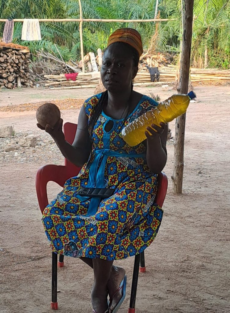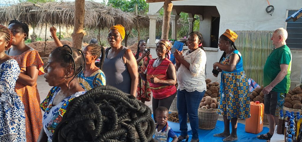 Im Anschluß fahren wir nach Jokole, dort treffen wir uns mit 3 Frauenguppen mit insgesamt fast 50 Frauen aus verschiedenen Regionen. Sie sind hauptsächlich in der Landwirtschaft tätig und produzieren rein biologische Produkte wie Palmöl, Kokosöl und daraus auch kosmetische Produkte wie Seife, Duschgel und Shampoo, sowie Speiseöle. Ihre Produkte verkaufen sie auf Märkten bis nach Lome. Sie haben uns im November schon mal eingeladen. Alles was sie seit vier Jahren produzieren haben sie selbst entwickelt und sich den Markt aufgebaut.