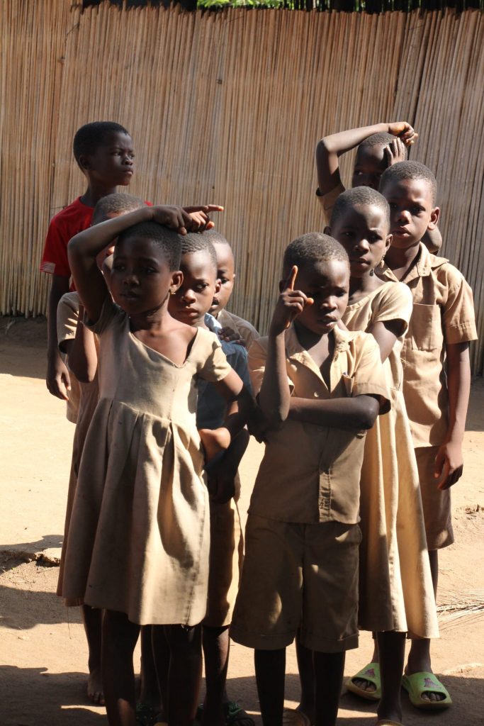 Unser nächster Termin steht an und wir fahren nach Danynou zur Baustelle der neuen Primärschule. Gestern hatten wir dort bereits einen Gesprächstermin mit dem Rektor, Lehrern und Elternvertretern vereinbart. Wir werden schon erwartet und die Kindergarten bzw. Vorschulkinder haben gerade Pause und empfangen uns mit vielen Jovo Jovo Rufen. Die Schülerzahlen sind seit unserem letzten Besuch extrem gestiegen. Der Rektor erklärt uns, dass wegen der sehr baufälligen Gebäude, in denen die Kinder in der Regenzeit z.T. in den Klassenzimmern knöcheltief im Wasser stehen, die Eltern ihre Kinder in den letzten Jahren auf andere Schulen geschickt haben. Jetzt wo sie sehen, dass ein neues Gebäude erbaut wird wollen sie ihre Kinder wieder in die Schule in der Nachbarschaft schicken und ihnen den weiten Schulweg in ein anderes, weiter entferntes Viertel ersparen. Die knapp 150 Vorschulkinder und Grundschulkinder werden von je 6 weiblichen und männlichen Lehrkräften unterrichtet. Mit den Verantwortlichen besprechen wir die Verträge zur Abwicklung der Eigenleistungen und die zukünftige Wartung und Betreuung der Gebäude. Bevor wir gehen werfen wir noch einen Blick in eines der Klassenzimmer. Neben der Tafel mit dem ABC, das die Kinder abschreiben gefällt uns sehr. Sehr angestrengt schreiben die Kinder die Buchstaben in ihr Heft. Daneben stehen auf der Tafel die Regeln für die Schule.
