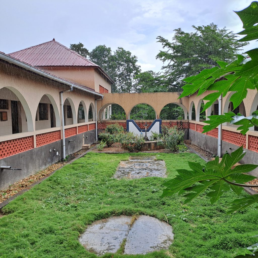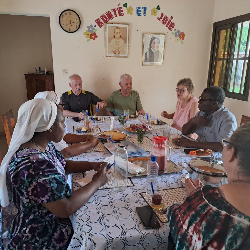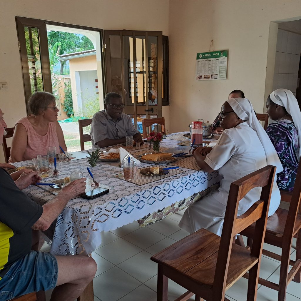 Wie immer werden wir wieder zu einer Erfrischung eingeladen. Es gibt frisches kühles Wasser, einen Aperitif aus Maniok, Honig und Rotwein, ein Früchtedessert, frisch gebackenes Knabbergebäck und einen FuFu Kuchen. Wir sind überwältigt von den leckeren Sachen. Die Schwestern erzählen uns, dass sie zur Zeit das sechzig jährige Jubiläum ihres Ordens feiern und deshalb gibt es besonders leckere Sachen. Jedes Jahr feiern sie dieses Jubiläum und dieses Jahr besonders groß.