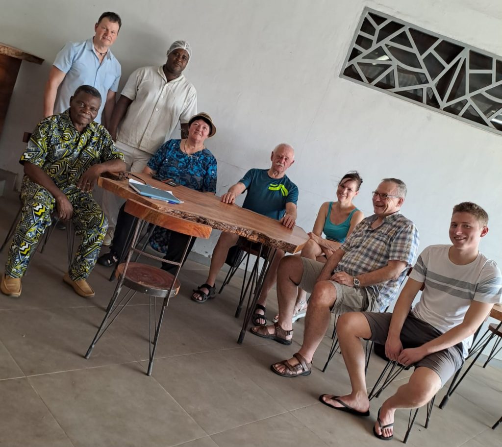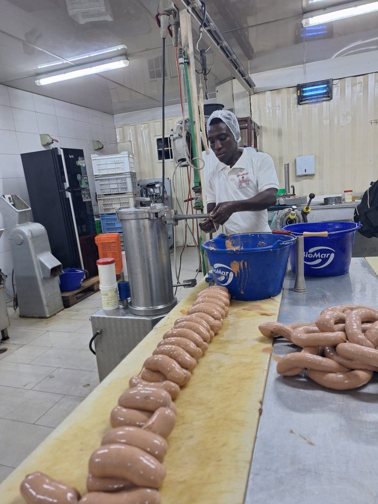 Wir sind begeistert von dem Betrieb und vom Engagement Koffi’s der auch eine 30 köpfige Jugendgruppe betreut und mit ihnen ein Orchester aubaut. Dazu hat er schon mehrere Musikintrumente aus unserem Container bekommen. Er erzählt uns auch von den Problemen, die er hat, weil es nicht so viele Leute gibt, die den für gute Qualität erforderlichen Preis bezahlen wollen oder auch können. Sehr stolz ist er, das er für die Mitarbeiter der Botschaft Wurst herstellen kann und z.B. auch für den Tag der deutschen Einheit Weißwürste produziert. Gerne versprechen wir ihm, das wir ihn auch in Zukunft unterstützen wollen und im November auf jeden Fall wieder kommen. Bevor wir uns verabschieden stellt er für uns noch Kostproben einer Wurstauswahl bereit, die uns allen sehr lecker schmeckt.