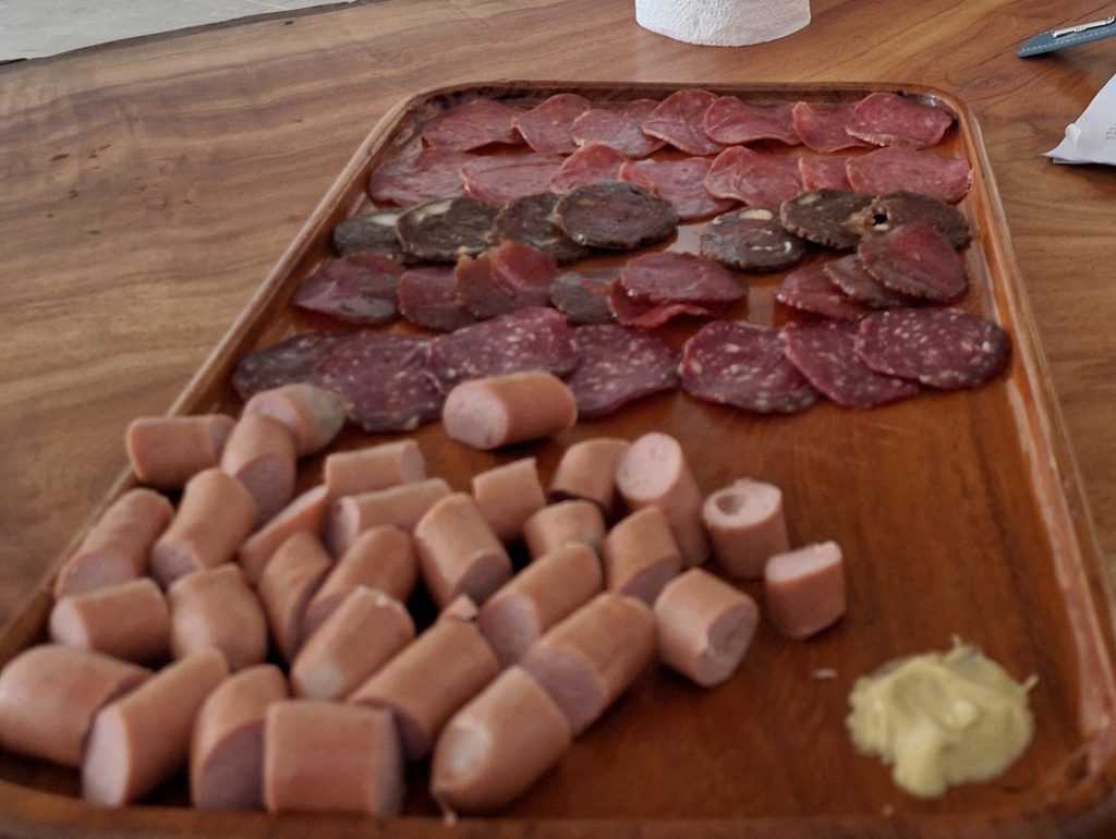 Er hat inzwischen mehrere Mitarbeiter und aus verschiedenen Hotels kommen auch Lehrlinge um bei ihm das Schlachten und die Herstellung von Wurstwaren zu erlernen.Montags ist der Betrieb normalerweise geschlossen, doch für uns hat er extra geöffnet und führt uns durch den Betrieb.