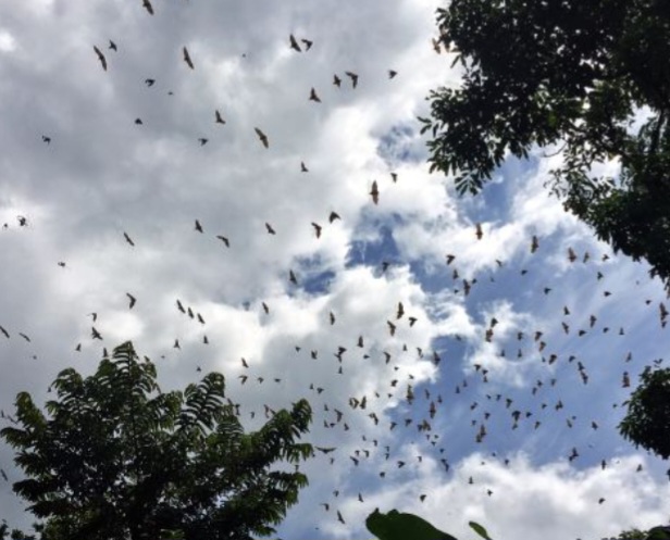 Kurz vor Atakpame in einemWaldstück tausende von fliuegenden Hunden. Am Abend kann man sie sehr oft am Himmel von Kpalime auf dem Flug in den Süden sehen. Die Togoer sagen sie würden nach Lome auf die Müllhalden vor der Stadt fliegen – ob das stimmt weiß ich nicht. Jetzt am Morgen kommen sie gerade zurück und lassen sich in den Bäumen nieder. Wir haben Glück – nicht immer sind sie so gut zu sehen.