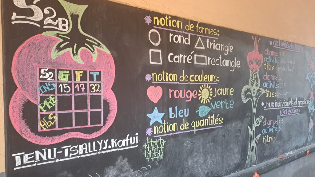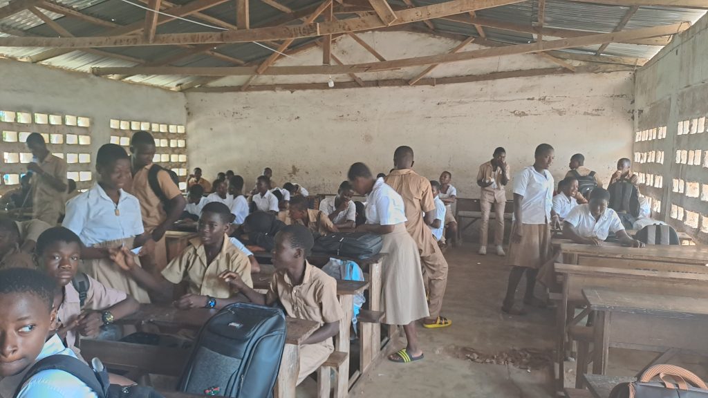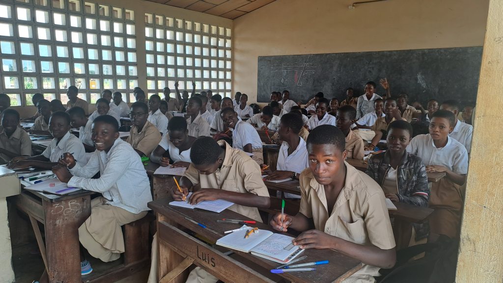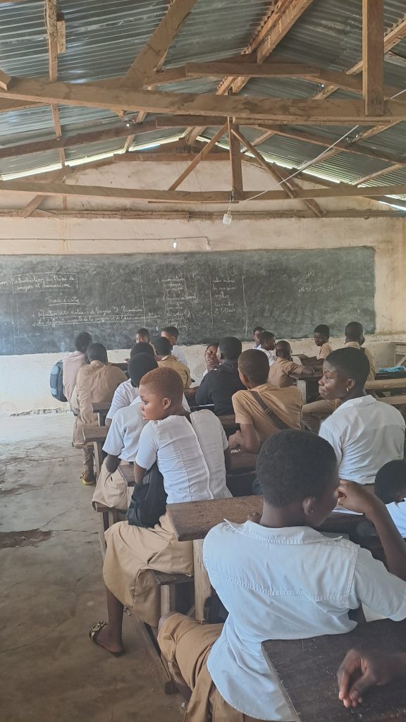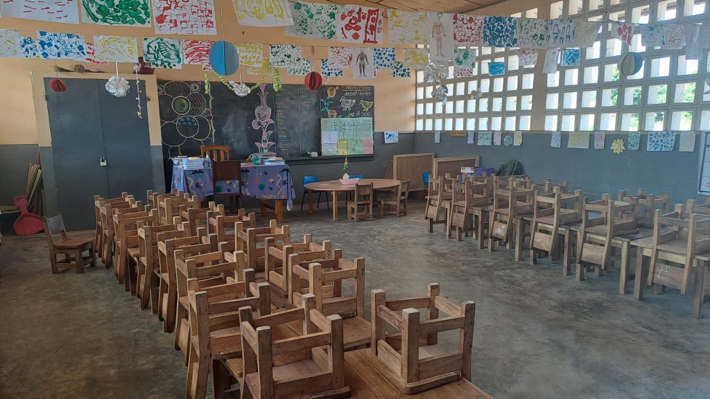 In dem Gebäude, das wir 2017 eingeweiht haben, sind in den 4 Räumen die Abschlußklassen untergebracht. Da die Bänke bis zur Tür und direkt vor der Tafel stehen, zählen wir die Kinder. In den 4 Zimmern sind 74, 78, 83 und 74 Schüler untergebracht.