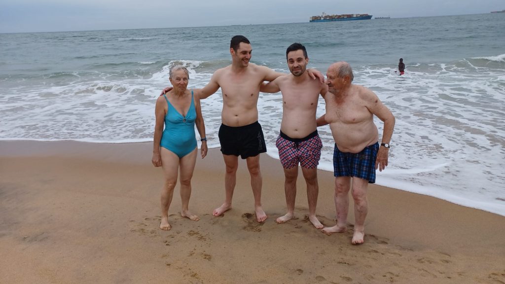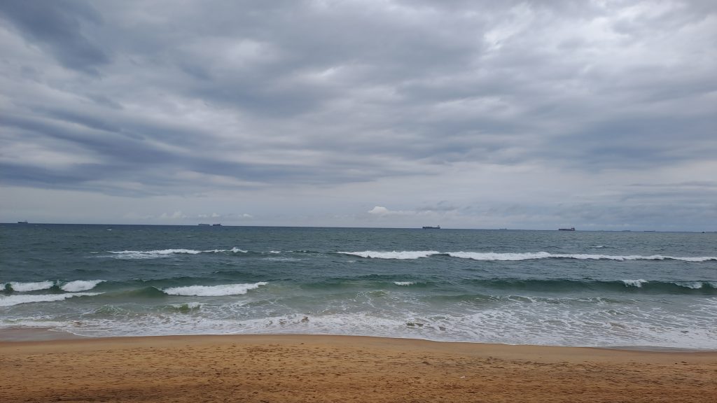 Heute ist auch in Togo ein kühler Novembertag -es hat 28°C und über 70 % Luftfeuchtigkeit. Trotz des Windes, des bewölkten Himmels und der starken Wellen sind einige Waagemutige im Wasser, das überraschender Weise sehr warm ist.