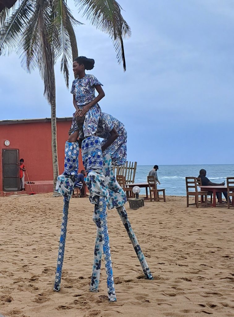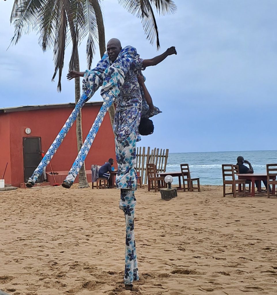 Wie immer verbringen wir die letzten Stunden im Restaurant des Hotel Robinson Plage. Sonntags ist das Restaurant immer gut gefüllt, denn vor allem ausländische Arbeitnehmer, Botschaftsangehörige, Jugendliche aus dem Freiwilligendienst usw. kommen am Wochenende hier her und genießen den Strand und das gute Restaurant. Oft sind auch Einheimische Künstler da und versuchen durch Darbietungen verschiedenster Art ein bisschen Geld zu verdienen.