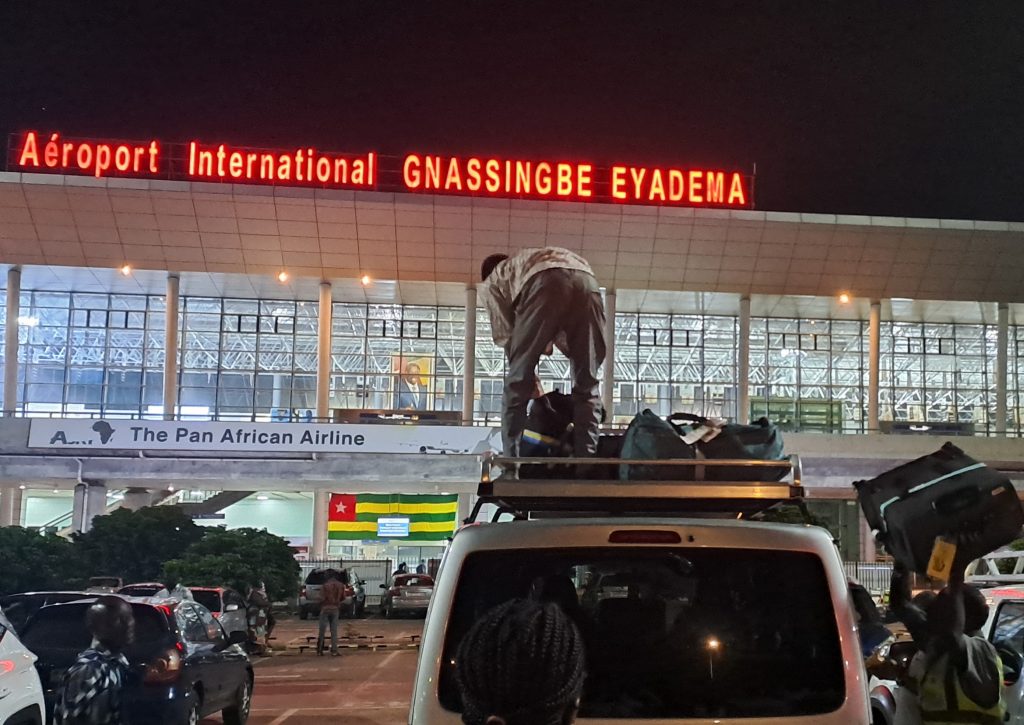 Der Service ist hervorragend und mit einer Punktlandung sind wir um 21.00 Uhr in Lome, wo dann wieder die größten Herausforderungen des Tages auf uns warten. Die Einreiseformalitäten sind wiederum recht langwierig und bis alles erledigt ist gehen 2 Stunden vorbei. Nach kurzem Hoffen und Bangen kam dann auch der letzte Koffer an und zum Glück ging es heute ohne Koffer Kontrolle durch den Zoll. Leon und Holali hatten schon lange gewartet und waren erfreut als wir endlich durch die Tür kamen. Bis der Kleinbus und das Auto mit den vielen Koffern beladen war, stellte die Fahrer auch nochmal vor Probleme.