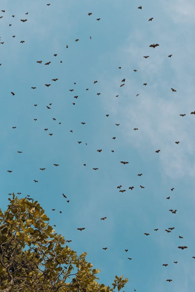 Jetzt am Morgen kommen sie von ihrem Nachtausflug zurück und wir haben das seltene Glück, das Schauspiel zu erleben. 1000ende Fledermäuse kreisen um die Bäume und hängen sich in die Äste.