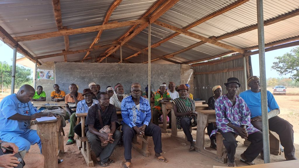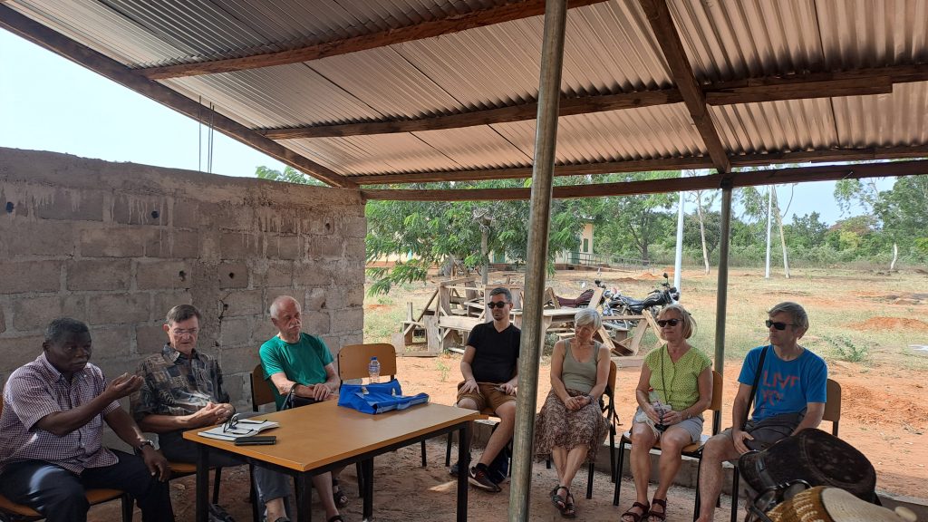 In der brütenden Mitagshitze kommen wir in Moumouame an. Der Bürgermeister wartet an einer Abzweigung auf uns, um uns den Weg zu zeigen. An der Schule werden wir von Lehrern, einigen Kindern und mehreren Erwachsenen erwartet. Da Sonntag ist, findet ja kein Unterricht statt. Houzowe, der Deutschlehrer erzählt mir dass zur Zeit viele – auch am Sonntag auf den Feldern arbeiten. Auch die Kinder müssen mit. Bohnen und Reis werden gerade geerntet.