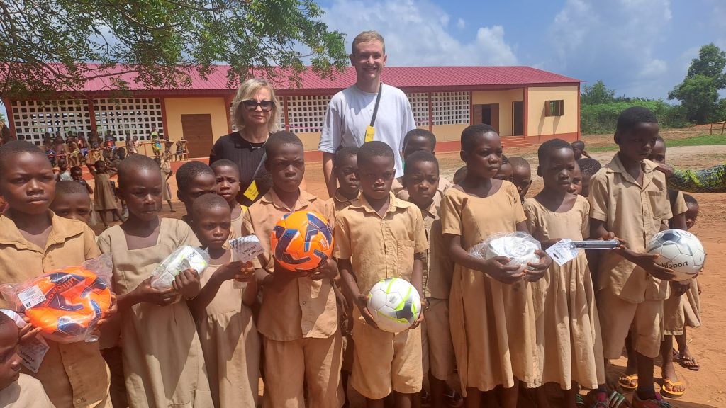 Zur ganz besonderen Freude der vielen Kinder hat Brigitte Nussbaum Fußbälle im Gepäck, die sie zusammen mit Hark an die Knder verteilt. Pro Klasse gibt es je 2 Bälle und 1 Pumpe.