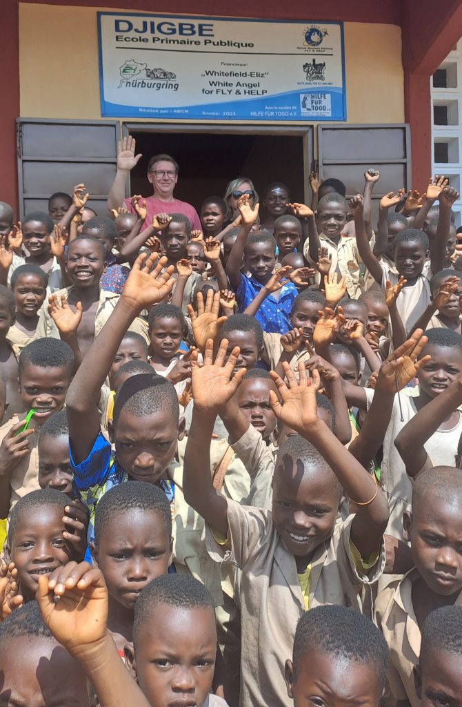 Es gibt Salat, Maispad, Poulet und leckeres Gemüse. Gut gestärkt brechen wir auf. Wir fahren nach Alenou, wo im vergangenen Jahr eine Schule im Rahmen des Projektes „1000 Schulen für unsere Welt“ eingeweiht wurde.