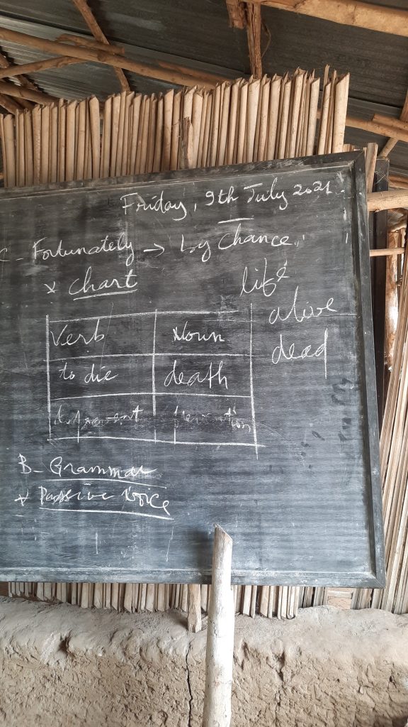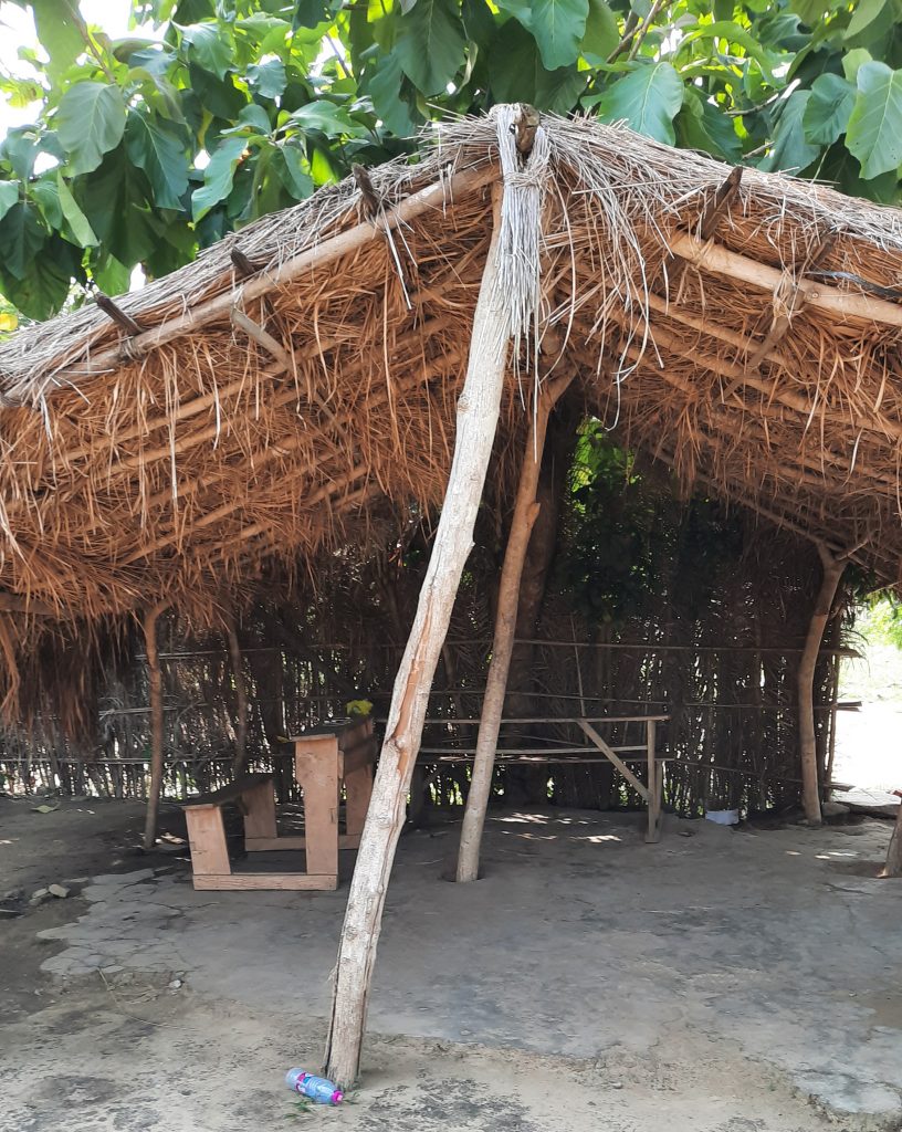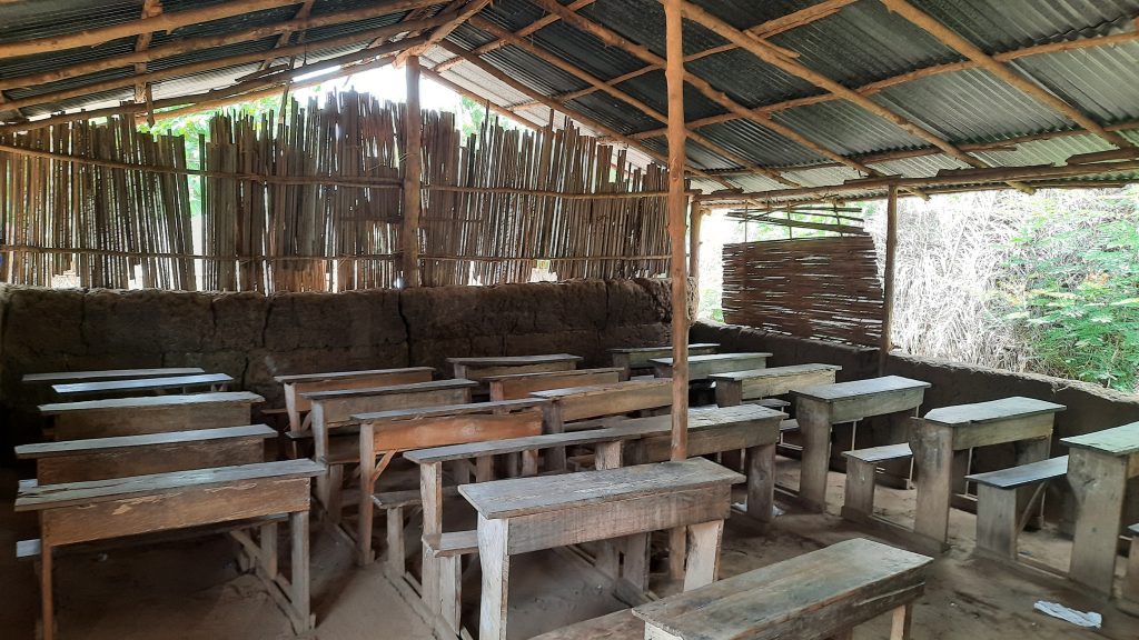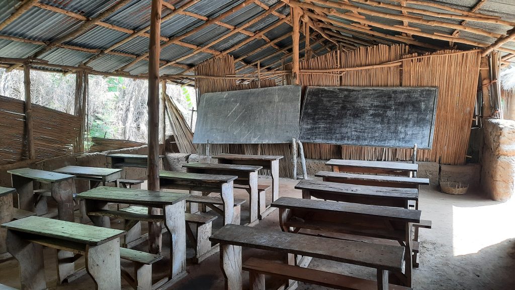 Die Klassenzimmer sind mit Schilfmatten voneinander abgetrennt, haben einen Lehmboden kaputte Blechdächer und alte wackelige Bänke.