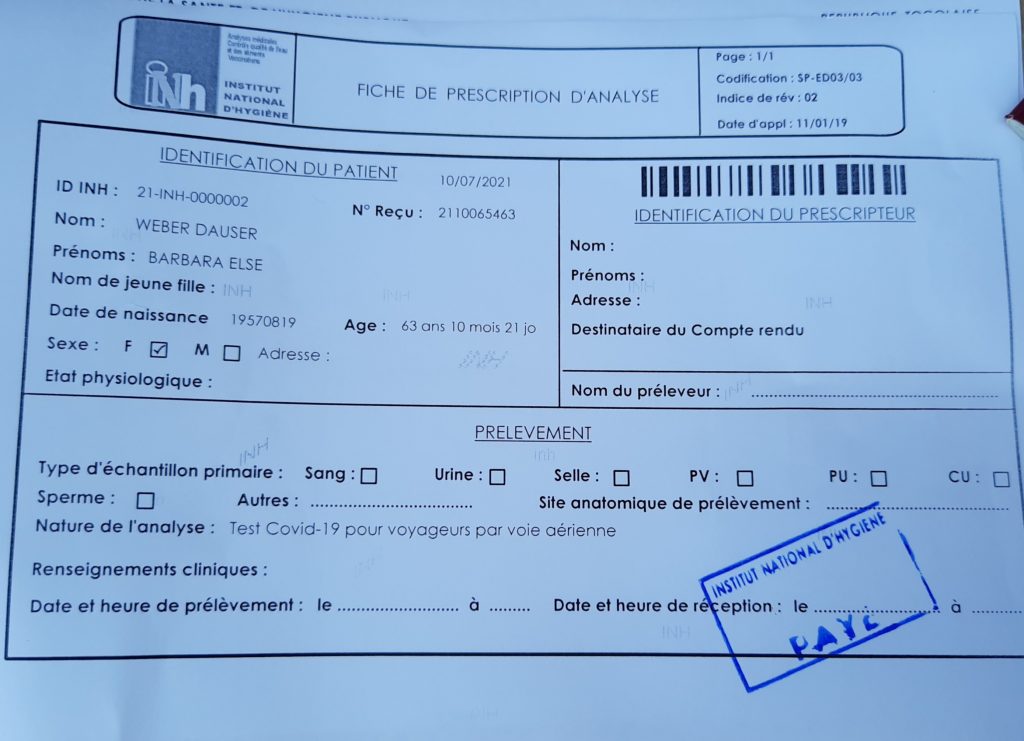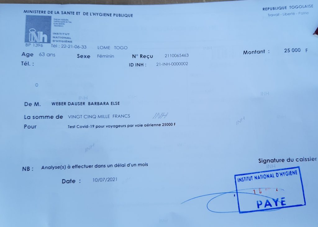 Vor unserer Reise mussten wir ein Online – Formular ausfüllen, das sehr umfangreich war. Es musste nach Togo geschickt werden und wir mussten 100,- Euro pro Person überweisen. Pro Person dauerte das knapp eine Stunde, weil zwischendurch das Netz überlastet war oder die Verbindung abgebrochen ist. Der Fragebogen war sehr umfangreich, so mussten wir z.B. neben vielen Informationen auch Vor- und Zuname, Geburtstag, Sterbetag und Berufe unserer Eltern angeben. Sechs Tage vor der Abreise mußten wir einen PCR -Test machen. In Togo am Flughafen mußte wieder ein PCR -Test gemacht werden und jeder mußte eine togoische Telefonkarte erwerben und installieren, damit wir immer erreichbar sind. Auch heute mußten wir alle Unterlagen von der Einreise + Impfpass und Reisepass vorlegen. Wir waren zeitig am Institut. Vor uns waren schon einige Leute und viele kamen nach uns. Alle mussten im Freien warten. Viele Stühle waren mit viel Abstand aufgestellt. Leon hat uns mit allen Papieren angemeldet, jeder bekam eine Nummer, die dann kurz darauf aufgerufen wurden. Wir hatten die Nummern 12 – 15. Einzeln wurden wir in eine der zwei Testkabinen gerufen. Nochmal wurden die Unterlagen geprüft. Name, Beruf, Handynummer und die Adresse des Hotels wurde notiert und dann wurde der Test gemacht. Alles lief ziemlich professionell ab. Ab morgen nachmittag können wir das Ergebniss abholen. Wir werden das aber erst am Montag erledigen, da wir sonst nochmal extra die zweistündige Strecke,nach Lome fahren müssen. Nach gut 1 1/2 Stunden ist alles erledigt.