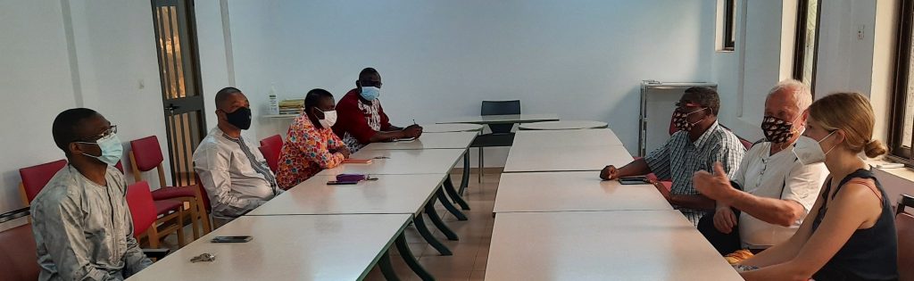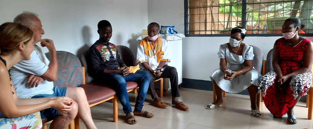 Mittwoch 7. Juli …. Auch heute haben wir wieder volles Programm. Gleich nach dem Frühstück bittet uns das Team aus dem Büro vom ABCN um ein Gespräch. Sie wollen sich im Namen aller Mitarbeiter und der Auszublidenden für unsere Unterstützung bedanken und bitten uns allen Helfern in Deutschland liebe Grüße und ein großes Agbekaka auszurichten. Erstmalig haben wir an die verantwortlichen Angestellten einen kleinen Erfolgsbonus ausbezahlt. In den letzten 1 1/2 Jahren konnten wir Corona bedingt nicht nach Togo kommen. In dieser Zeit musste der Inhalt von drei Containern entladen und verteilt werden. Unzählige Unterlagen für die einzelenen Bauwerke mussten gefertigt werden. Die Mitarbeiter des Sekreteriats und des Planungsbüros im ABCN war oftmals bis in die Nacht beschäftigt und haben hervorragende Arbeit geleistet.