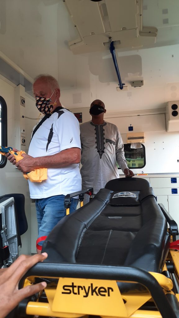 Gemeinsam begutachten wir den Krankenwagen und versprechen im nächsten Container Material (Verbandsmaterial, Pflaster, Scheren, Pinzetten, Spritzen, Nadeln usw.) mit zu schicken, damit die Schubladen befüllt werden können und das Fahrzeug voll funktionsfähig ist. Wir werden auch versuchen eine leere Sauerstoffflasche bzw. ein mobiles Beatmungsgerät zu organisieren.