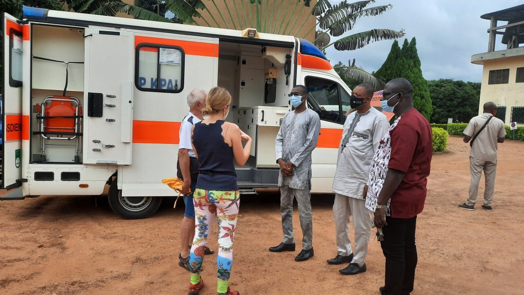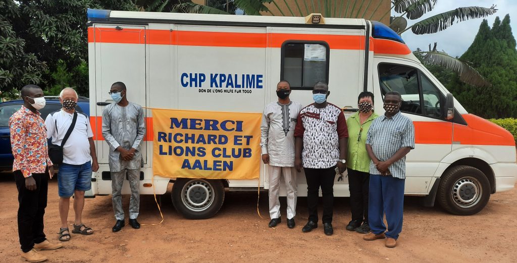 Wir fahren danach gleich zum Krankenhaus in Kpalime, wo wir einen Krankenwagen übergeben, der durch die Initiative von Richard Salzer vom Lions Club Aalen gespendet wurde. Das Fahrzeug hat schon eine weite Reise hinter sich. Bereits vor einem Jahr ging es auf dem Schiff in Richtung Lome. Kurz vor der Ankunft sind mehrere Besatzungsmitglieder an Corona erkrankt und das Schiff mußte zurück nach Antwerpen. Dort stand der Krankenwagen, dann eine ganze Weile, weil kein Schiff zur Verfügung stand. Nun ist er genau zur richtigen Zeit angekommen, denn das bisherige, sehr alte Fahrzeug hat vor kurzem den Geist aufgegeben.