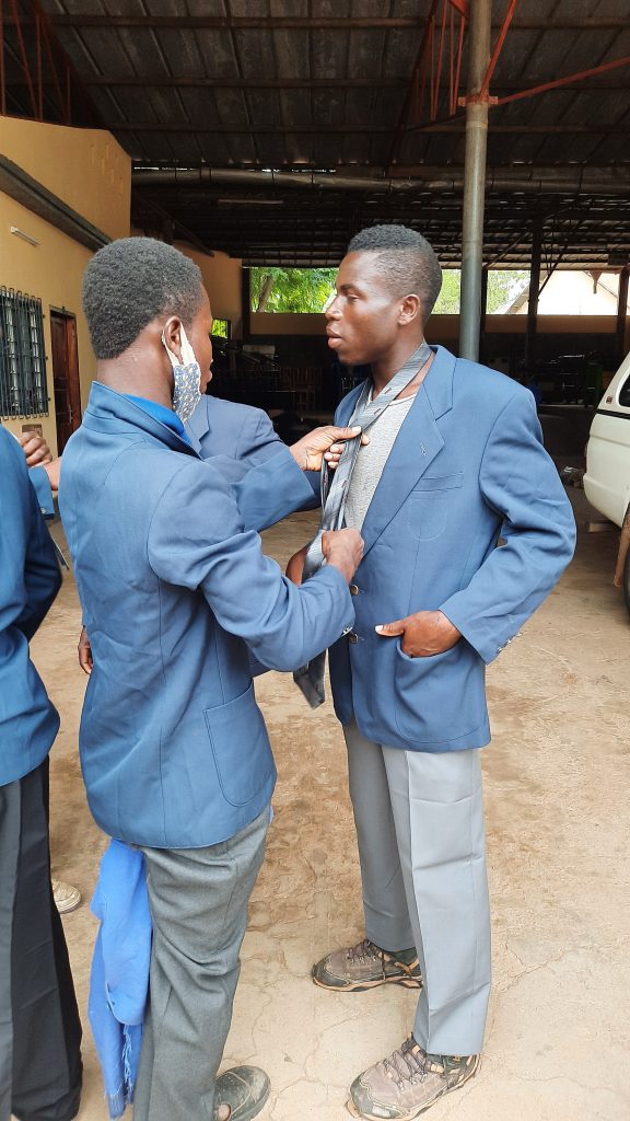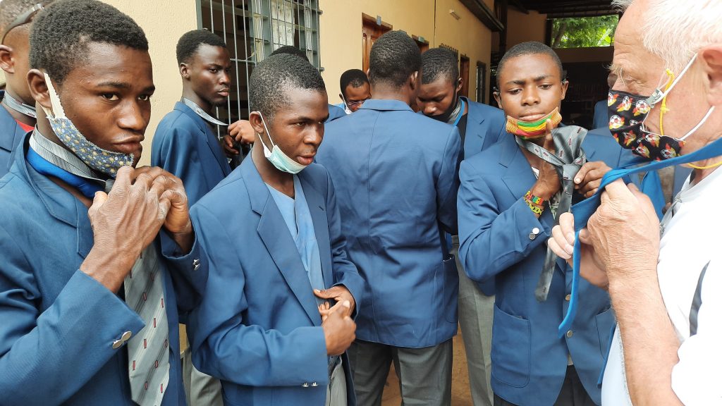 Die Freude ist riesig über den neuen Sonntagsanzug und Done macht mit den Jungs einen Krawatten Bindekurs, bei dem alle viel Spaß haben.