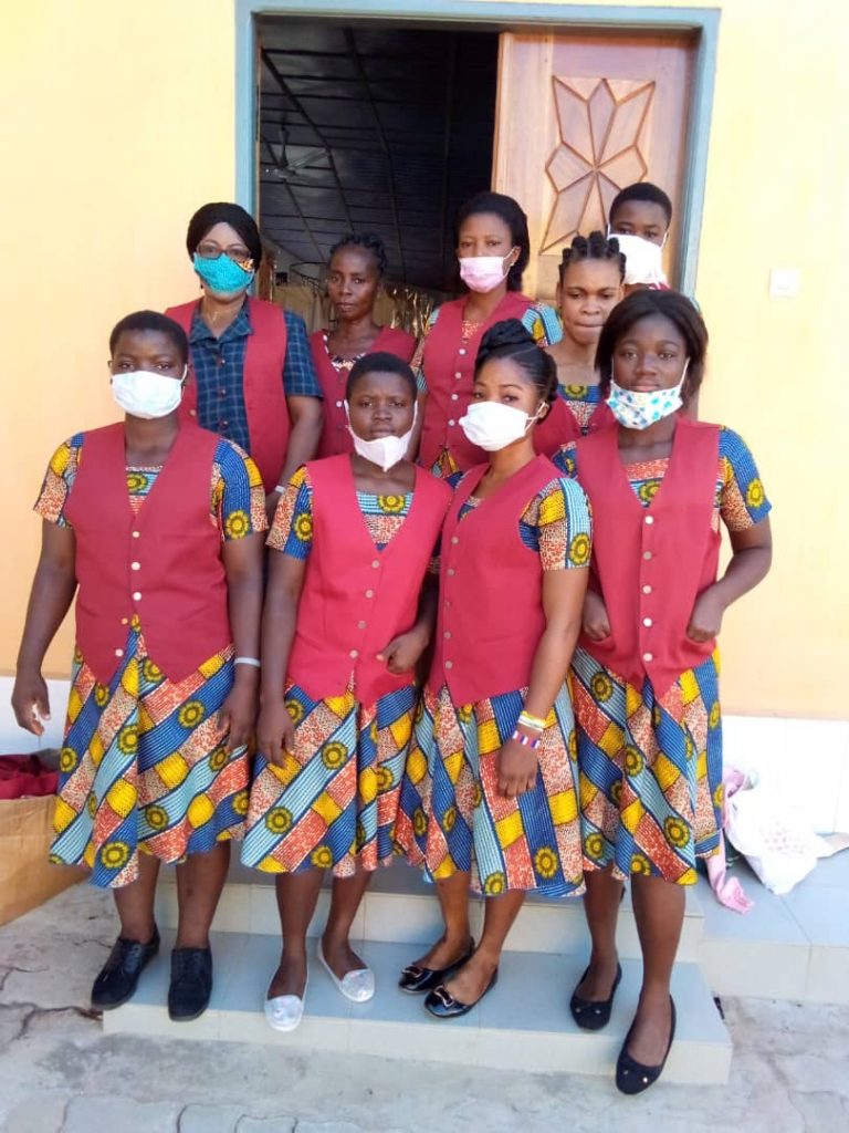 Die roten Westen bekommen die Mädchen der Schneiderei. Sie passen sehr gut zu ihren Kleidern. In Togo ist es üblich, daß alle Mitarbeiter einer Formation die gleichen Kleider oder Hemden haben. Die Mädchen sind ganz begeistert von ihrem neuen Outfit. Die Kleider haben sie im Unterricht selbst genäht und die Westen passen farblich hervorragend dazu.