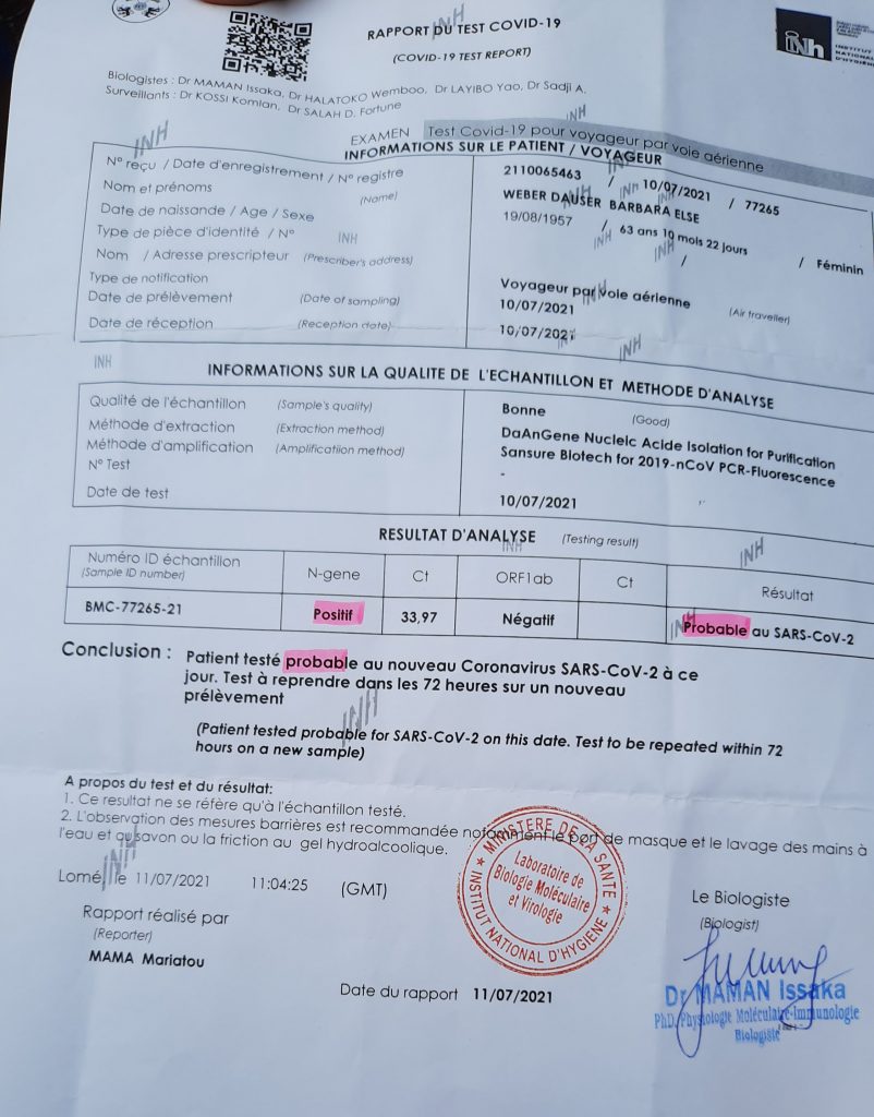 Zwei der Reiseteilnehmer waren negativ und zwei negativ/positiv… was heißt, daß der Test wiederholt werden muß. Noch waren wir entspannt, da wir ja alle zweimal geimpft sind, keiner Fieber hatten und es uns allen sehr gut ging. Also meldeten wir uns sofort für einen zweiten Test an. Der zuständige Mann lehnte lässig in seinem Sessel und erklärte uns, daß dies erst am Donnerstag möglich ist. Da unser Flug am Abend ging waren wir natürlich schon erschrocken, aber alles Zureden und Bitten half nicht. Wir haben beraten und sind dann ins Büro der Air France gefahren … In dem Büro wurde uns dann von dem Mitarbeiter ganz lapidar mitgeteilt, daß wir auf jeden Fall einen neuen PCR Test brauchen der negativ ist. Er meinte: „Den müssen sie im Nationalen Hygiene Institut machen lassen …. aber das funktioniert heute eh nicht mehr … am besten sie annullieren jetzt gleich ihren Flug und buchen um auf nächste Woche“. So leicht wollten wir uns aber nicht geschlagen geben … also zurück, durch die halbe Stadt, zum Hygiene Institut … da war dann gerade Mittagspause und da lässt sich ein Afrikaner ja schon gar nicht stören. Inzwischen hat Leon mit einem Arzt telefoniert, dessen Nummer er vom Prefäkten aus Kpalime hatte und Done mit dem Honorarkonsul aus München und der Sekretärin des deutschen Botschafters in Lome. Leon hatte Erfolg, es kam ein Mitarbeiter des Hygiene Institut, der uns durch viele andere Wartende schleuste und es wurde ein Test gemacht… Den kleinen Unmut ließ uns die Testerin beim Abstrich dann schon spüren… Wir bekamen wieder unser Formblatt, mit dem wir um 17.00 Uhr unser Ergebnis abholen können….Jetzt fuhren wir zum Flughafen wo wir ein Online – Formular ausfüllen mussten, dass man ebenfalls zur Ausreise benötigt…. wieder mit so unsinnigen Fragen wie das Geburts – Sterbedatum unserer Eltern…unsere zwei Allgaier – Mädels waren beim ausfüllen eine große Hilfe. Ein mit einem großen Gewehr bewaffneter togoischer Soldat kam den Mädels zur Hilfe…Done und ich blieben beim Auto, da das Schloß kaputt ging und wir unser Gepäck nicht unbewacht lassen wollten. Der Soldat gab den Mädels seine Telefonnummer und versprach am Abend für uns da zu sein. Nun ging es wieder quer durch ganz Lome zum Hygiene Institut. In der Hoffnung, daß die Tests evtl. früher fertig sind standen wir bereits um 16.00 parat. Der Test war natürlich noch nicht fertig…Mit einem Blick auf unseren Zettel meinte der Zuständige:“ Es ist noch nicht 17.00 Uhr“. Um17.50 Uhr war am Airport Schluß mit der Gepäckaufnahme und unter besten Voraussetzungen dauert die Fahrt zum Flughafen 30 Minuten… so langsam wurde es sehr eng… Wir warteten auf dem Hof…wo wir dann weggeschickt wurden. Aus Hygienegründen dürfen wir da nicht warten…also raus auf die Straße und nur Leon blieb im Hof….ja und die Uhr lief weiter und so langsam wurde es sehr eng…jetzt begannen wir auf der Straße die Koffer umzupacken, für die zwei die evtl. in Togo bleiben müssen. Leon ist mit dem gesamten Gepäck und den beiden negativ getesteten zum Flughafen gefahren, denn jetzt war es schon sehr knapp und wir hatten schon Angst, daß auch die zwei den Flug verpassen würden. Leon hat seine Tochter Holali angerufen, sie kam mit ihrem zukünftigen Mann nur wenige Minuten, nachdem wir unser negatives PCR Ergebnis hatten und nun ging es in abenteuerlichen Fahrt in Richtung Flughafen..es war bereits 17.30 Uhr. Schon im normalen Straßenverkehr haben wir oft Sorge daß alles gut geht … aber was wir an der Fahrt erlebt haben übersteigt alles was wir bisher in Togo erlebt hatten. Es war wie bei einer Verbrecherjagd in einem Krimi. Riskante Überholmanöver und volle Pulle ging es über Kreuzungen und rote Ampeln… und in falscher Richtung in eine Einbahnstraße… In der Zwischenzeit haben die beiden anderen Reiseteilnehmer (erfolgreich) versucht die Dame an der Gepäckaufnahme (die eigentlich schon geschlossen war) bei Laune zu halten. Der Soldat stand parat und hat die zwei Nachkömmlinge mit seinem Maschinengewehr im Arm durch eine große Warteschlange buxiert….von unseren lieben Freunden in Togo konnten wir uns kaum verabschieden und buchstäblich in letzter Sekunde konnten alle vier Reiseteilnehmer in den Flieger steigen…. ich glaub sowas geht nur in Afrika … Wir sind allen unseren lieben Freunden in Togo sehr dankbar für ihre Unterstützung und sagen ein herzliches Agbekaka. Das war so toll wie uns alle geholfen haben.