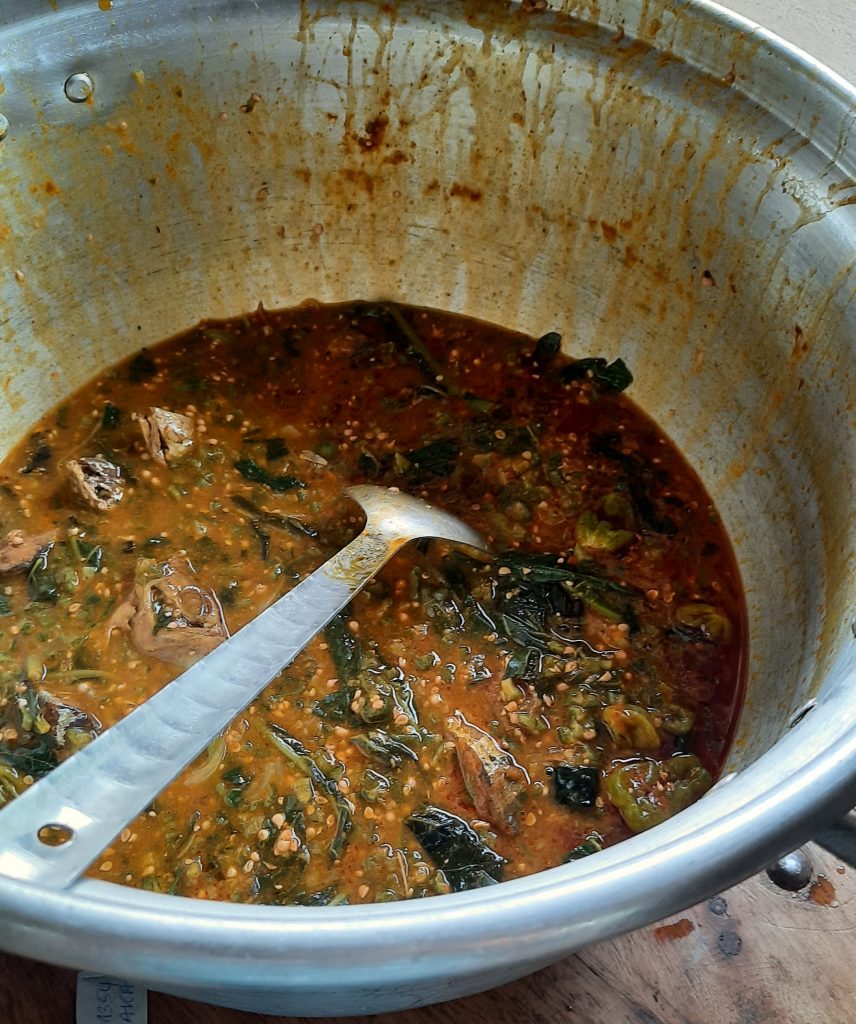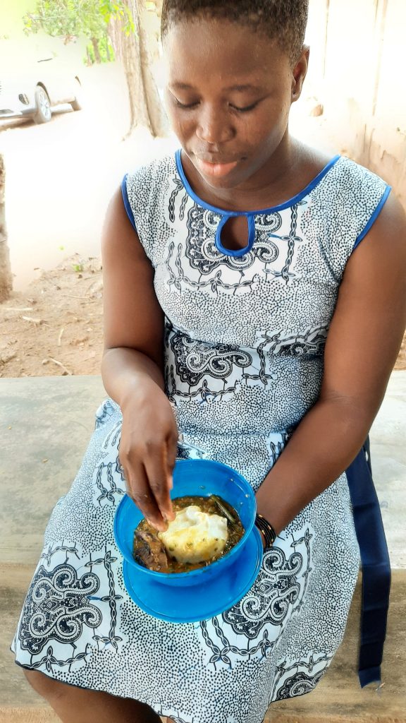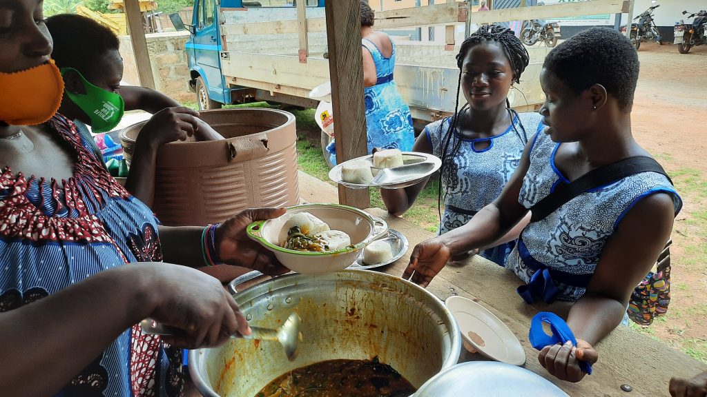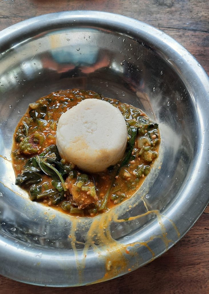 Rechtzeitig zum Mittagessen sind wir wieder im ABCN. Die Lehrlinge bekommen gerade ihr Mittagessen. Heute gibt es „Gambo“, das ist eine ziemlich schleimige Soße aus der Gambofrucht. In der sehr scharfen Soße sind noch Fischstücke und dazu gibt es Maispat.