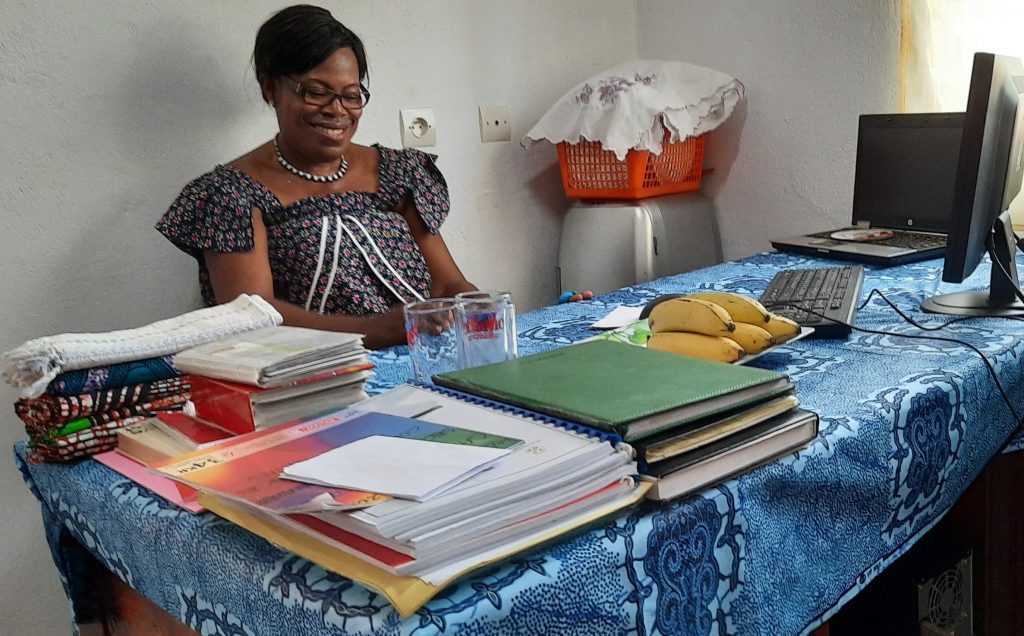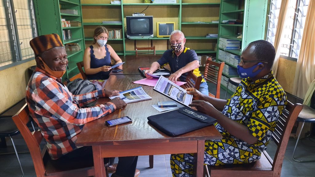 Alexandra und Done haben eine Besprechung mit Fritz und von Apdil. Sie machen die Endabrechnung für den Schulbau in Kpeta.