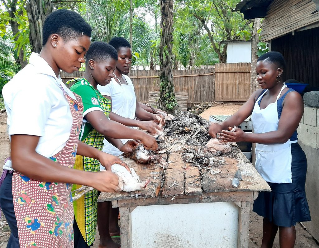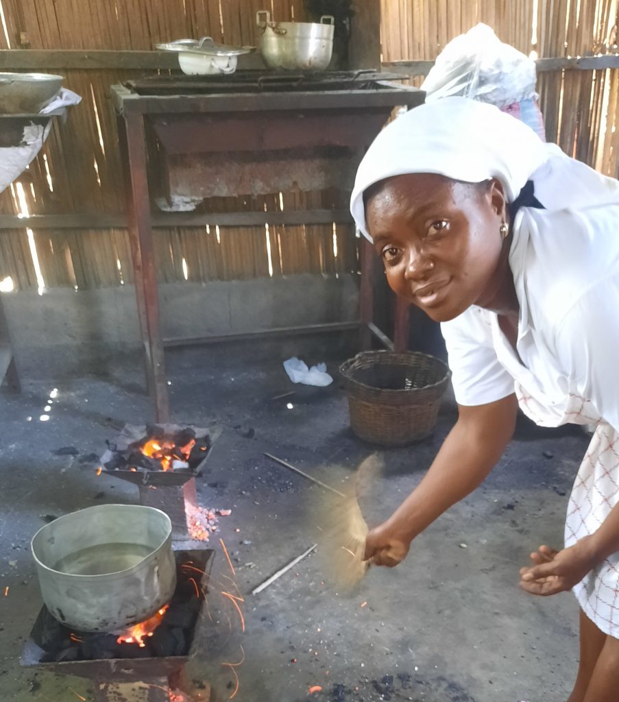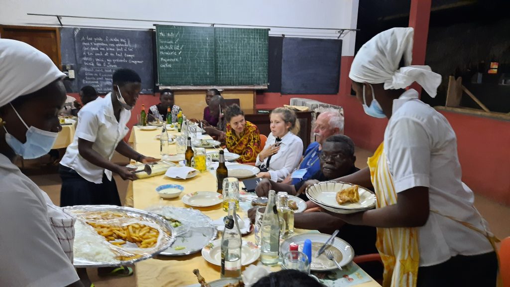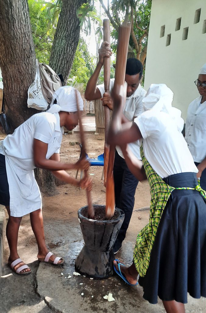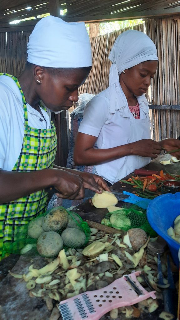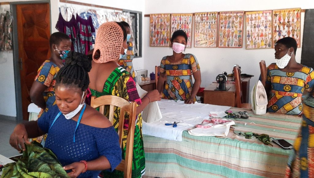 Der neueste Ausbildungsbereich wurde im vergangenen Jahr geschaffen. Seit November 2020 ist die Schneiderei in Betrieb. Die Mädchen absolvieren gleichzeitig eine hauswirtschaftliche Ausbildung, da sie meistens aus sehr ärmlichen Verhältnissen stammen. Victorine, die Ausbilderin sagte uns, daß es wichtig ist den Mädchen beizubringen wie ein Haushalt geführt wird. Mindestens einmal in der Woche kochen sie zusammen und außerdem lernen die Mädchen auch wichtiges über gesunde Ernährung, Finanzen im Haushalt, Wäschepflege usw.. Wöchentlich haben sie auch eine Stunde Unterricht über Aidsvorsorge, Empfängnissverhütung, Gesundheitsvorsorge und Ethik.